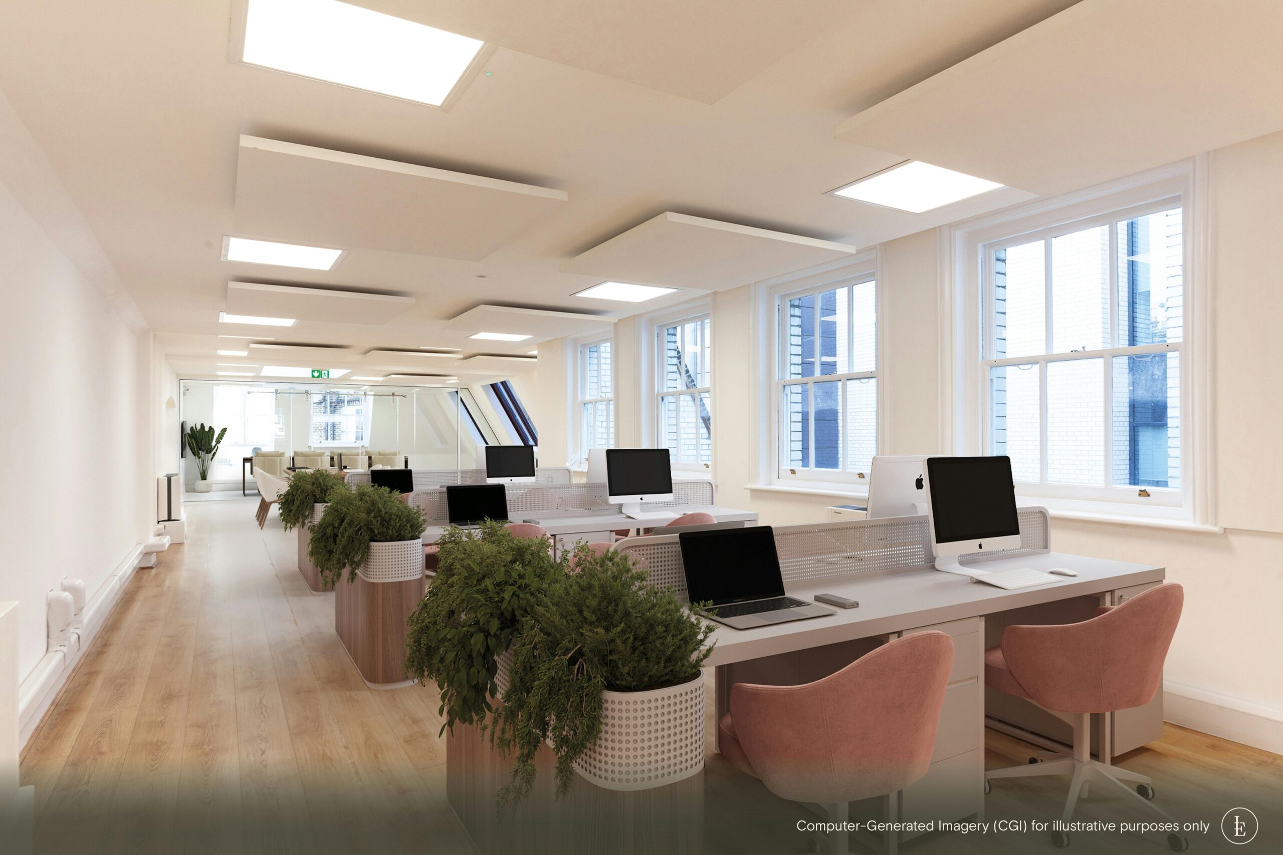 47–50 Margaret Street provides around 3,587 sq ft across multiple recently refurbished floors, with suites ranging from 390 to 2,510 sq ft. One floor is offered fully furnished, ideal for quick occupation, while others remain unfurnished for occupiers to adapt to their needs. The building offers open-plan layouts, excellent natural light, LED lighting, air conditioning, lift access and perimeter trunking. Positioned between Regent Street and Great Portland Street in Fitzrovia Quarter, it is well connected and close to central London amenities.