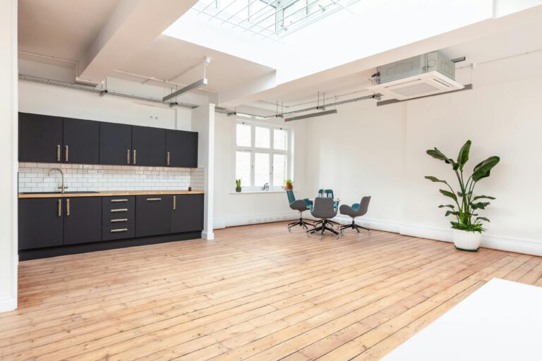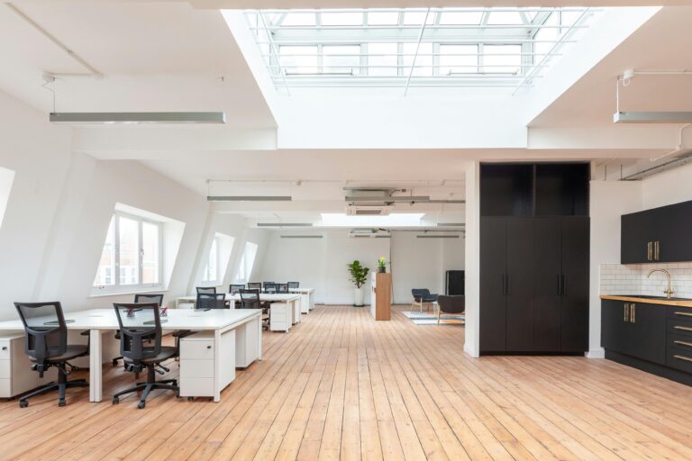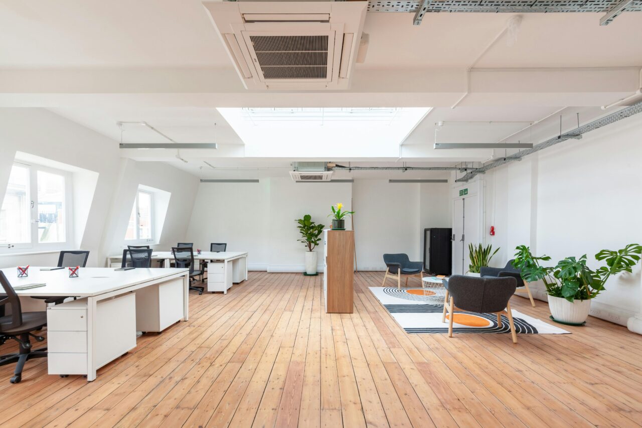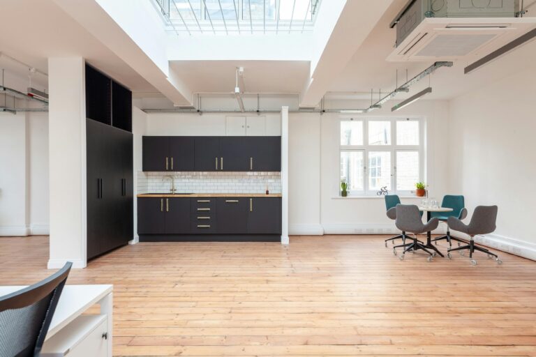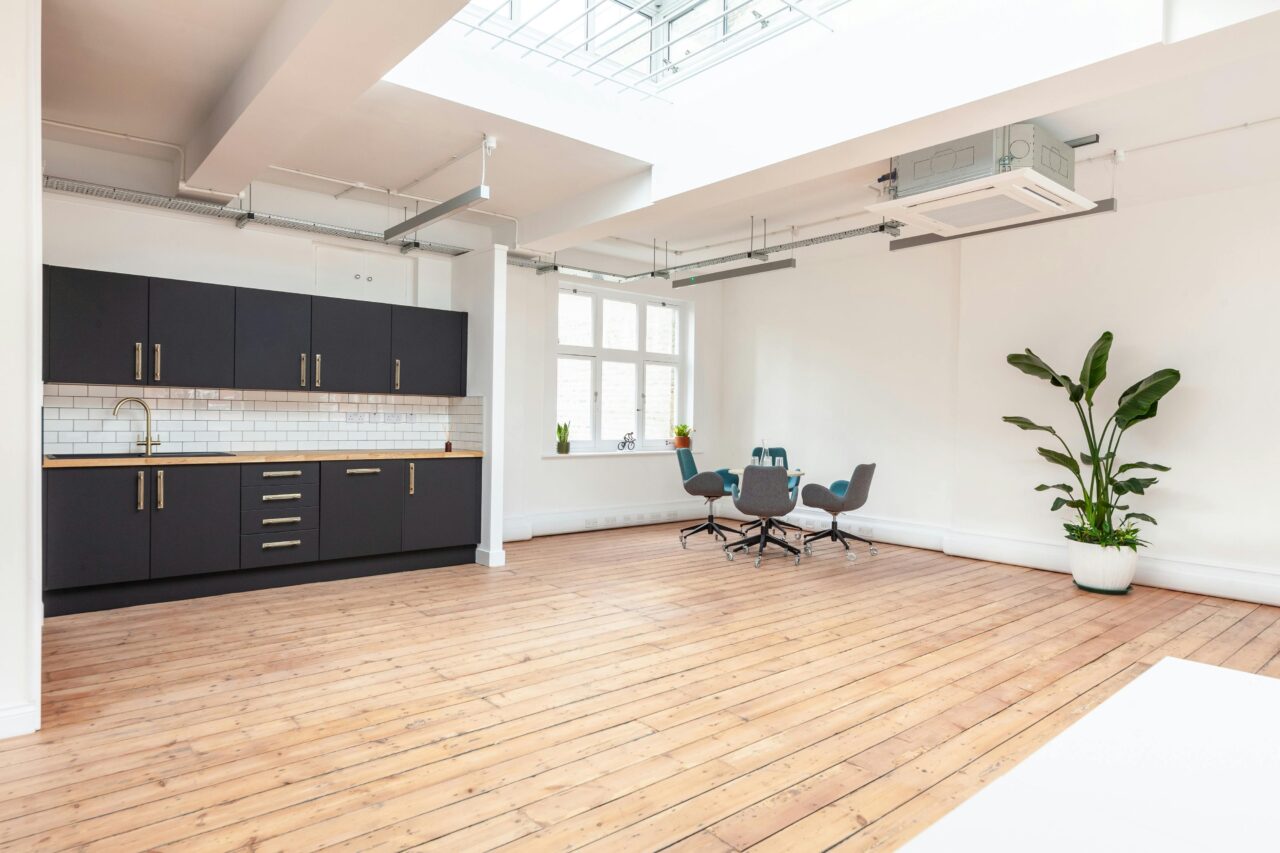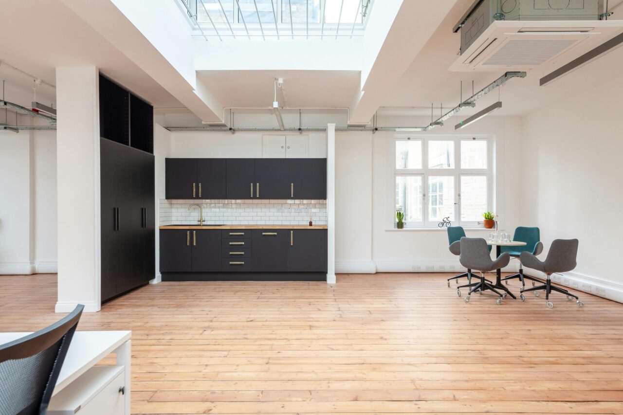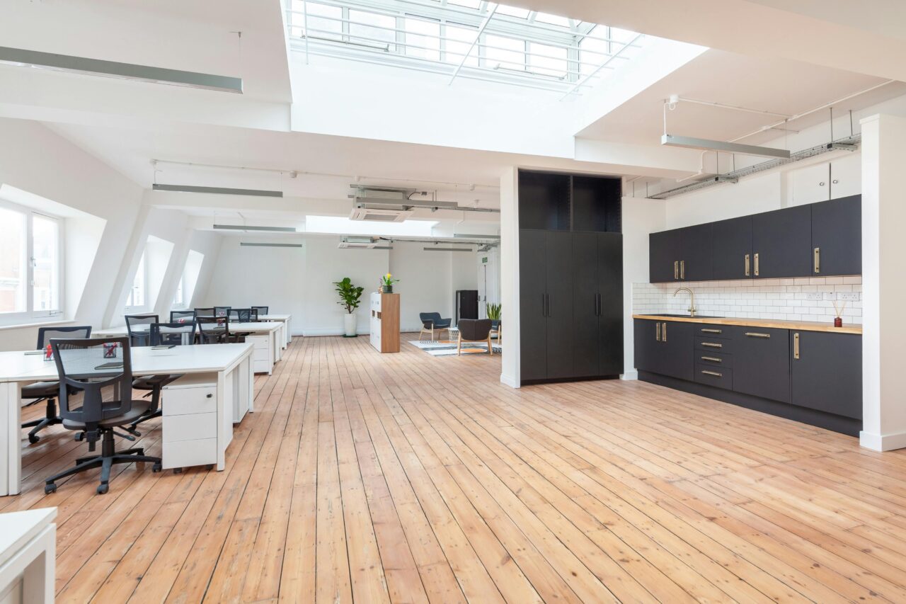 Open plan office suite boasting a private kitchenette, A/C, skylight and feature lighting.